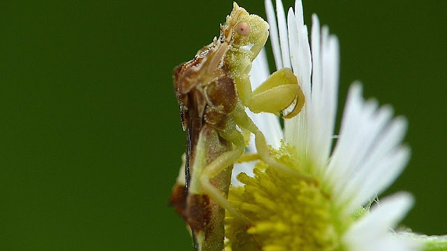 What are Ambush bugs? They're diminutive insects (about 3/8" long) in the Phymatinae family, but not to be taken lightly if you're an insect up to the size of a small bee. Their modus operandi is to lie patiently amongst the tiny blooms of goldenrod flower heads, and others, in the hope that prey will blunder into them, much to the peril of the unsuspecting.